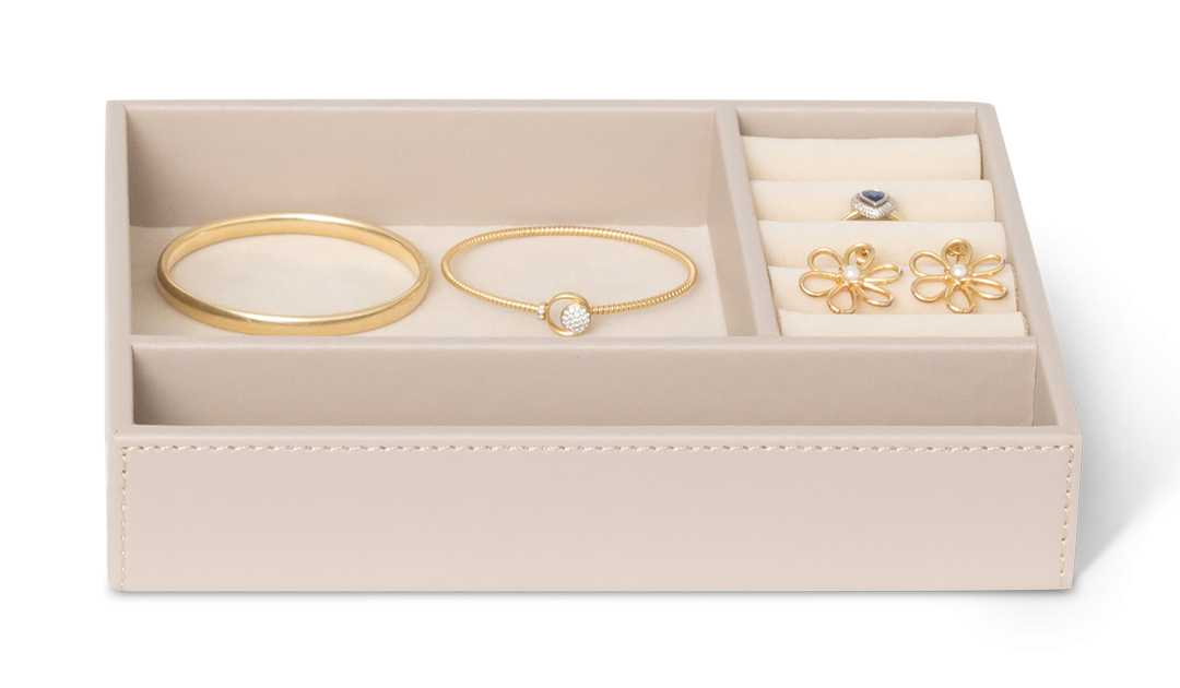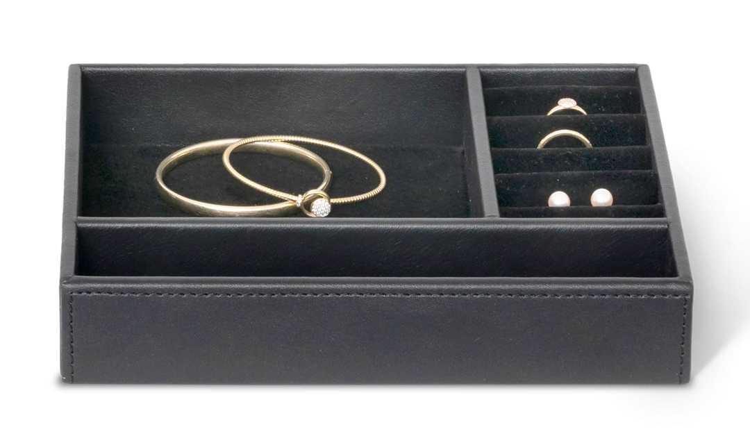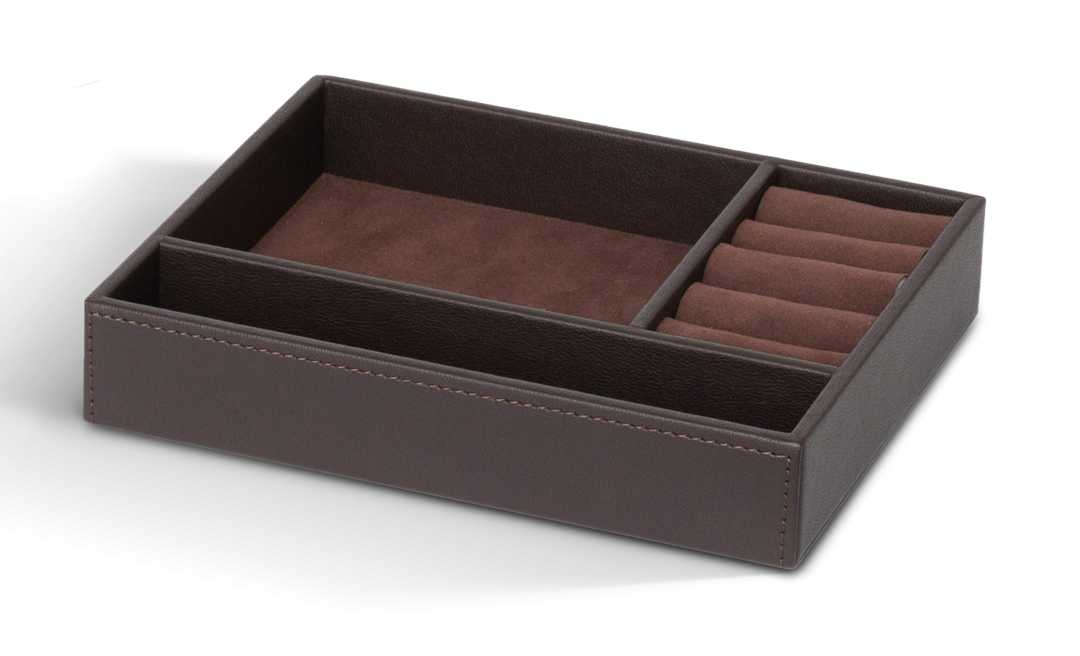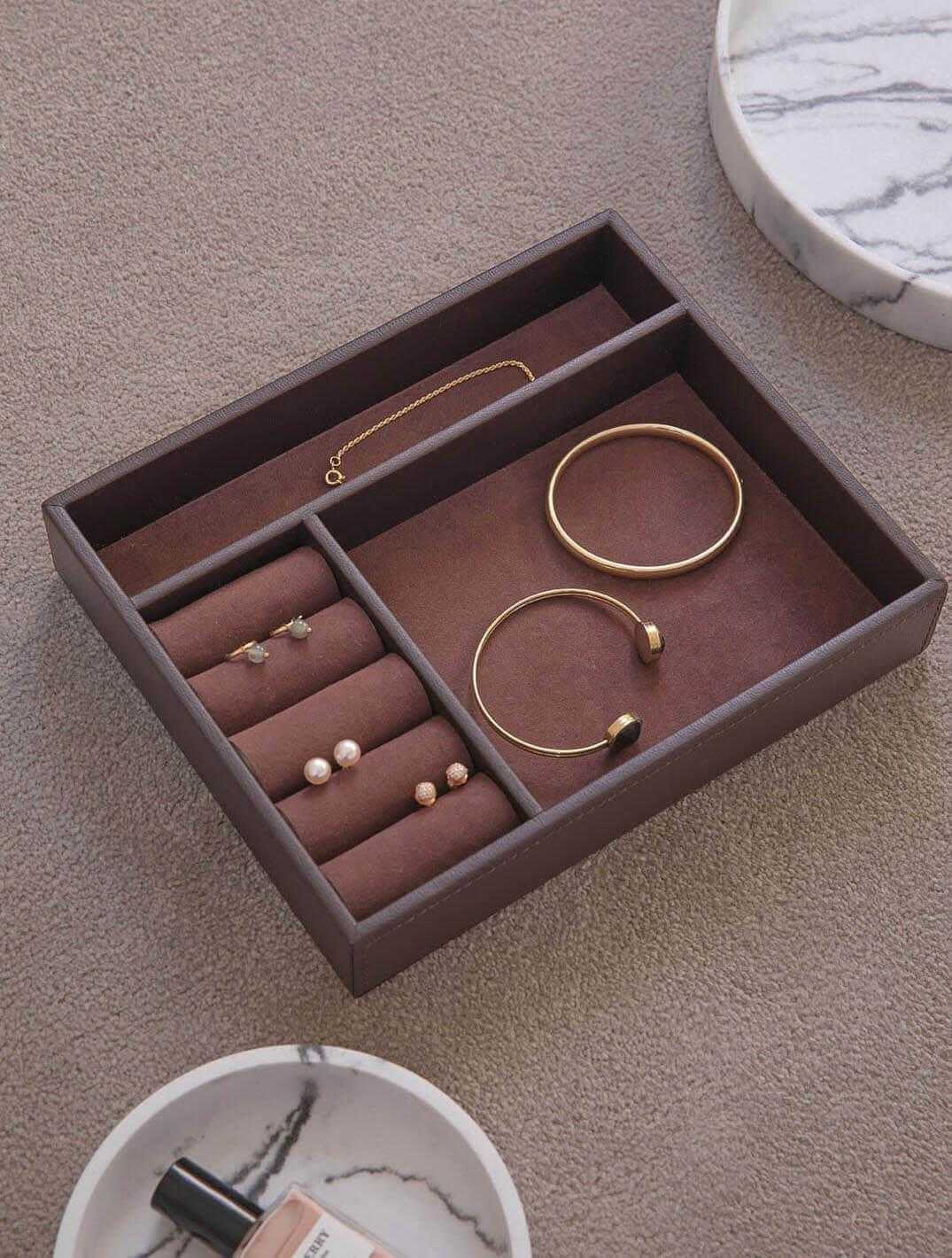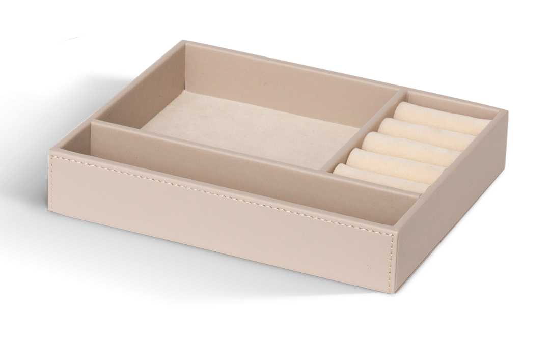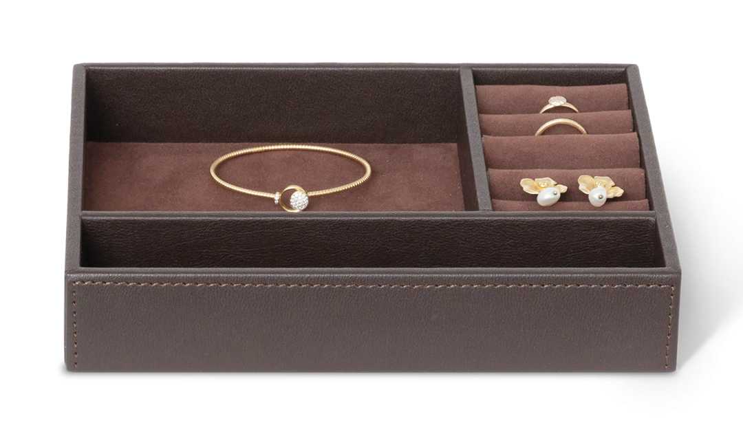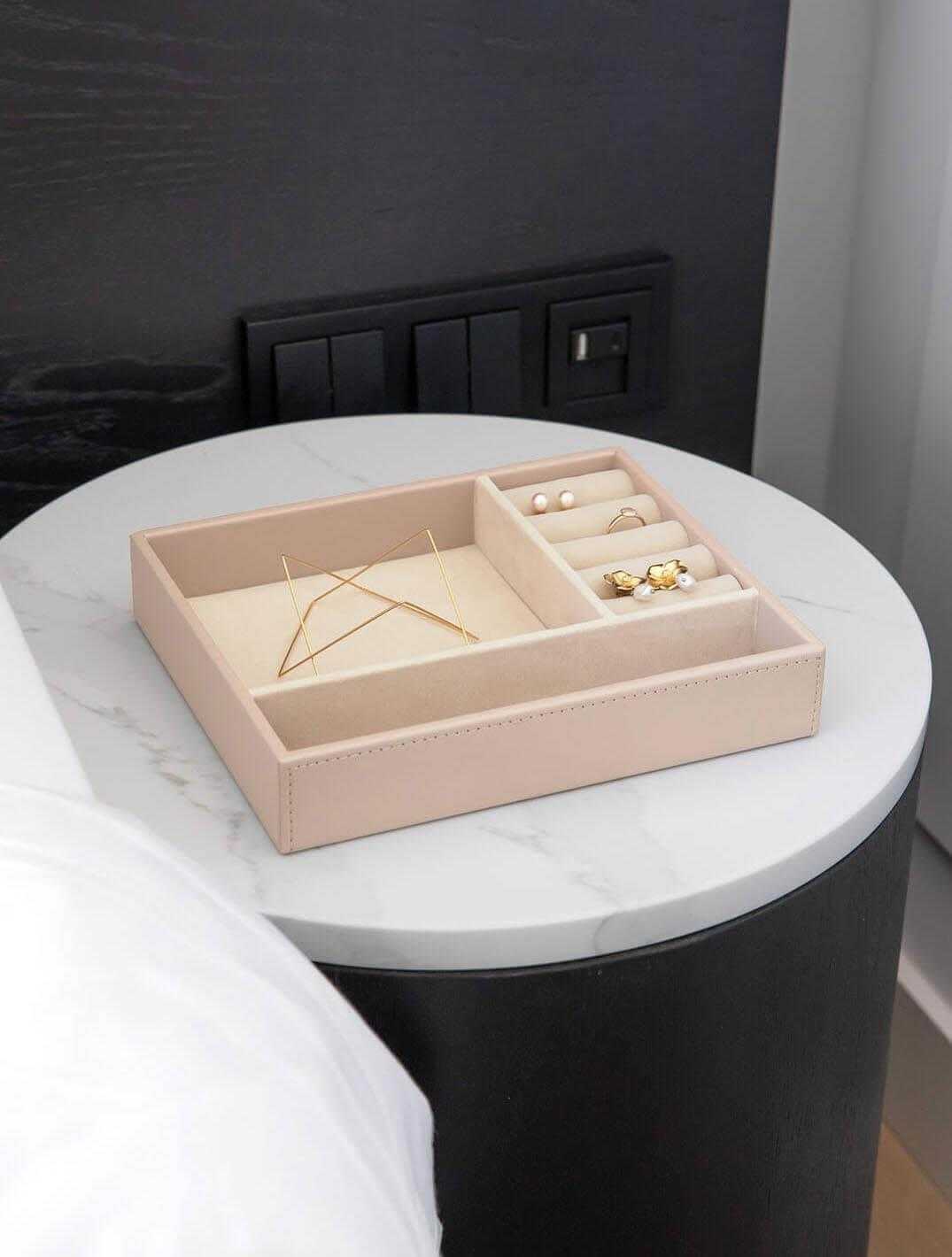 The Andros Jewellery Tray is available in three colour options: black, brown and natural. It features a fabric-covered exterior with stitched details and a velvet-lined interior. Suitable for placing jewellery and watches. Its dimensions fit most hotel safes. The surface is water-repellent and easy to clean.