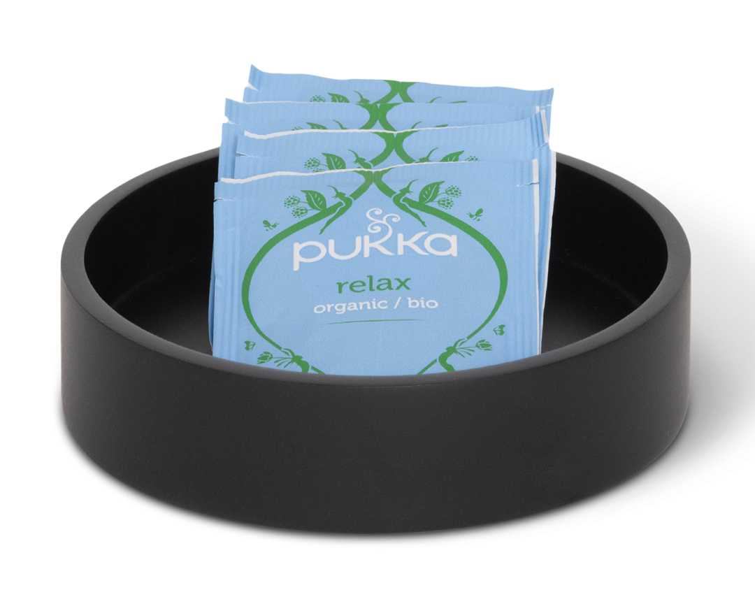 The Bentley Ibu Amenity Tray features a unique round design with an elegant black texture, providing a refined solution for presenting coffee and tea amenities. Its sophisticated look adds a touch of elegance to any hotel room.