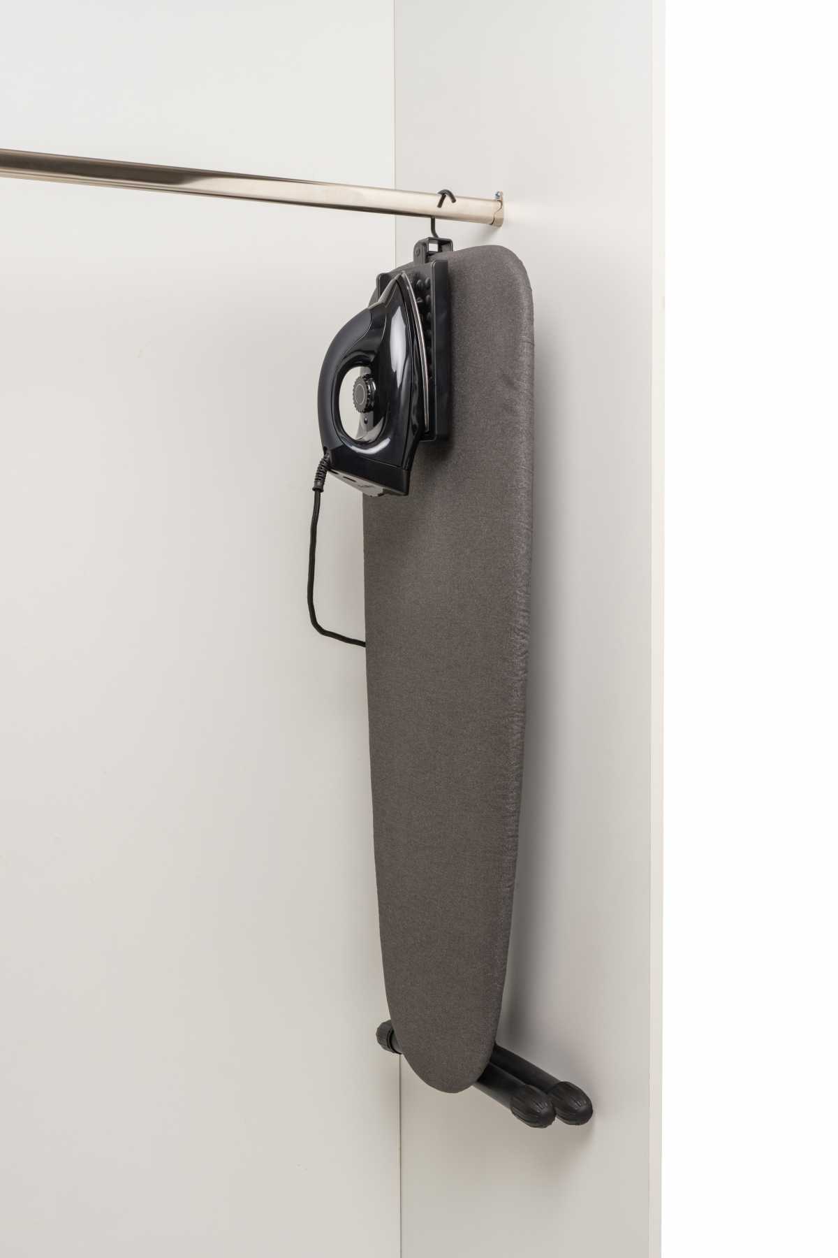 The Bentley Premium Organiser at Top is a practical and space-saving solution that allows you to conveniently store your ironing board and iron inside the wardrobe, thanks to its integrated hanger. The bracket is made of strong metal, while the organiser section is crafted from heat-resistant plastic. Rubber inserts prevent the iron from sliding, ensuring safe storage.