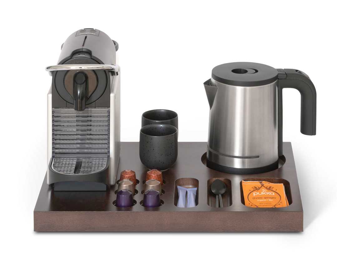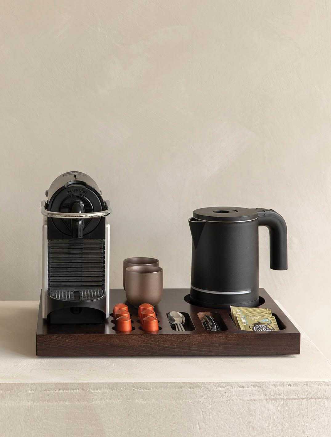 The tray features an integrated space for the kettle base, three compartments for sachets and spoons, and six dedicated recesses for Nespresso capsules—ensuring an organised and stylish setup for your guests’ hot beverage experience.