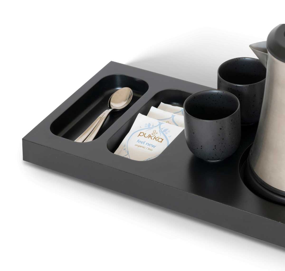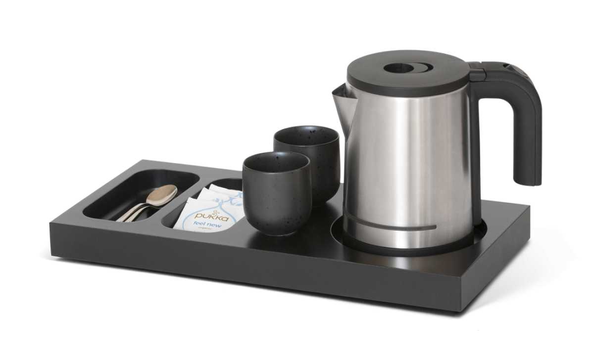 With an integrated space for the kettle base and two indentations for sachets and spoons, guests can conveniently prepare their own tea or coffee. The tray’s rounded corners make it exceptionally easy to clean.