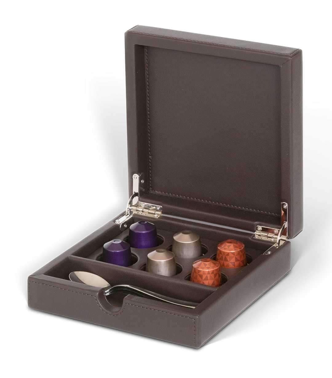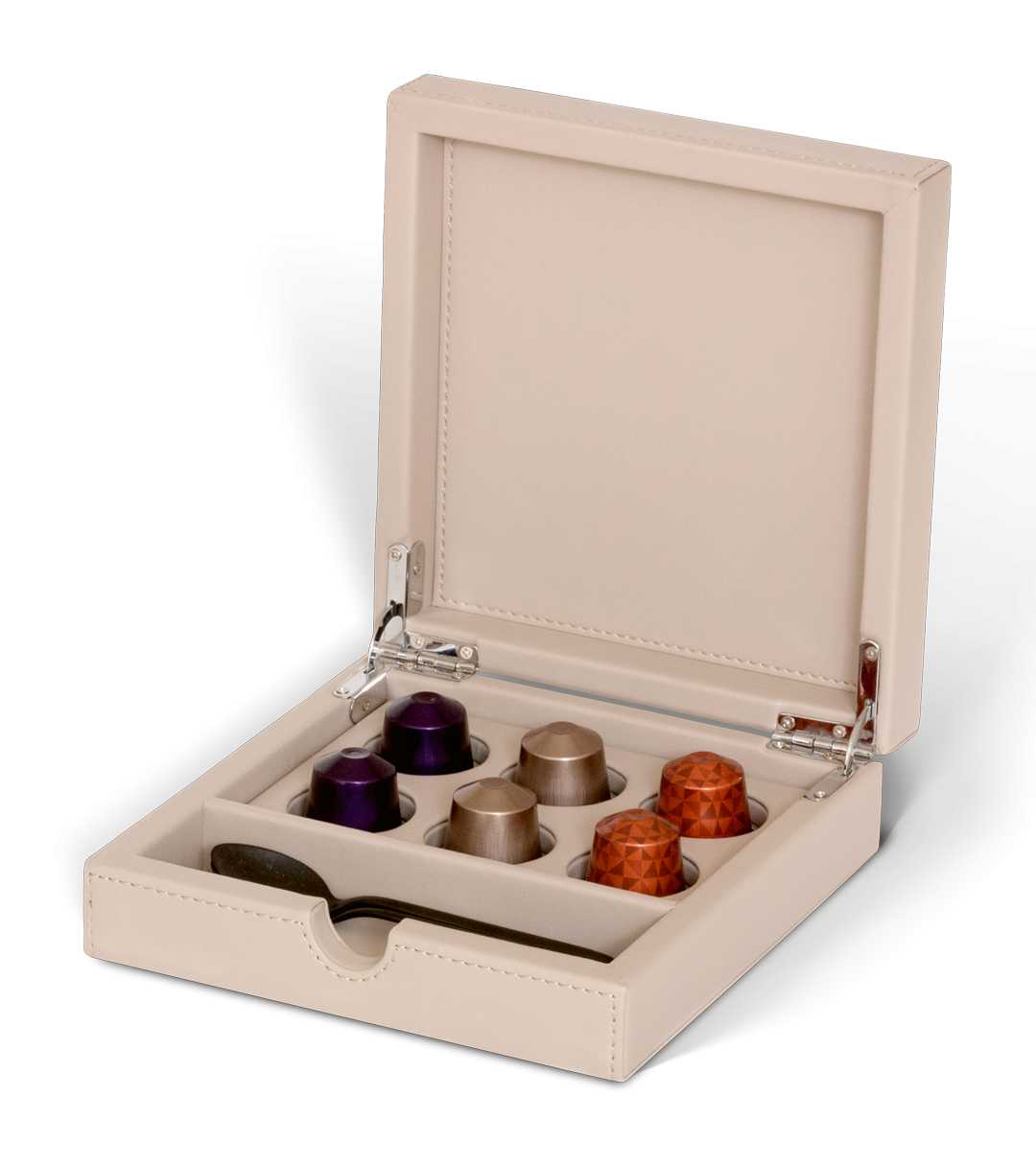 The Bentley Yasur Condiment Box with lid adds a touch of elegance to any hotel room. Crafted with premium fabric and fine stitching, this stylish box is ideal for showcasing and storing your coffee amenities. The removable divider holds up to six capsules, allowing for easy organization and accessibility. Thanks to its water-repellent surface, the box remains clean and well-maintained over time. Combining aesthetics and functionality, the Yasur Condiment Box enhances your guest experience with refined practicality.