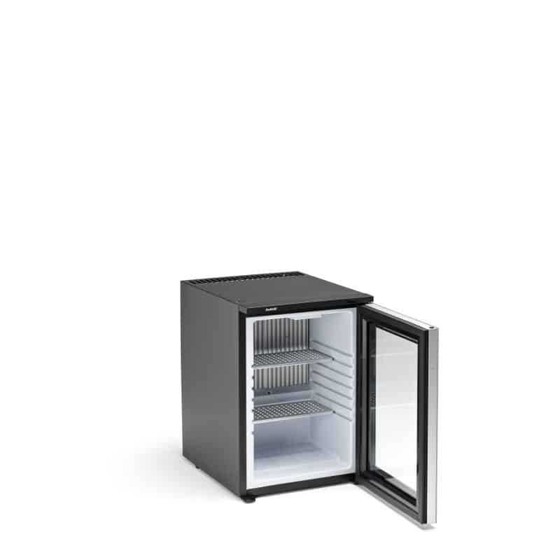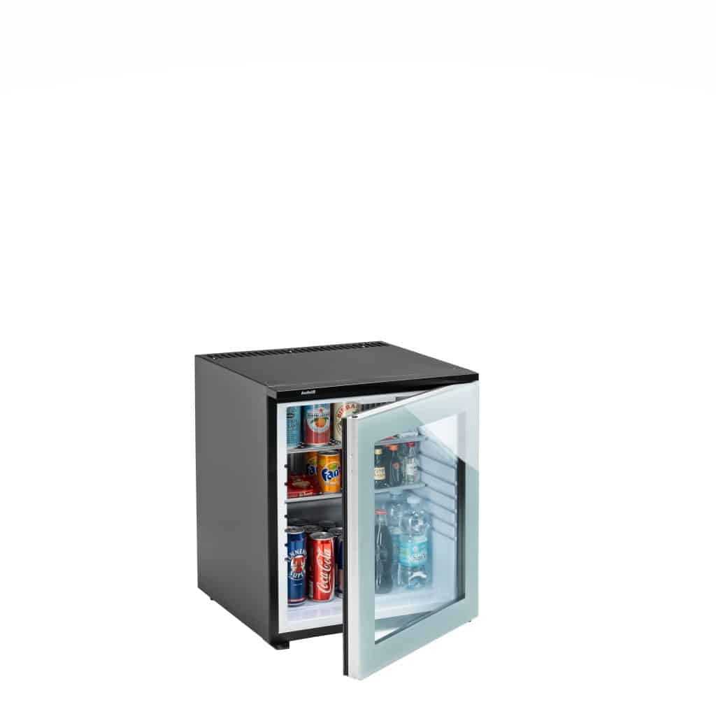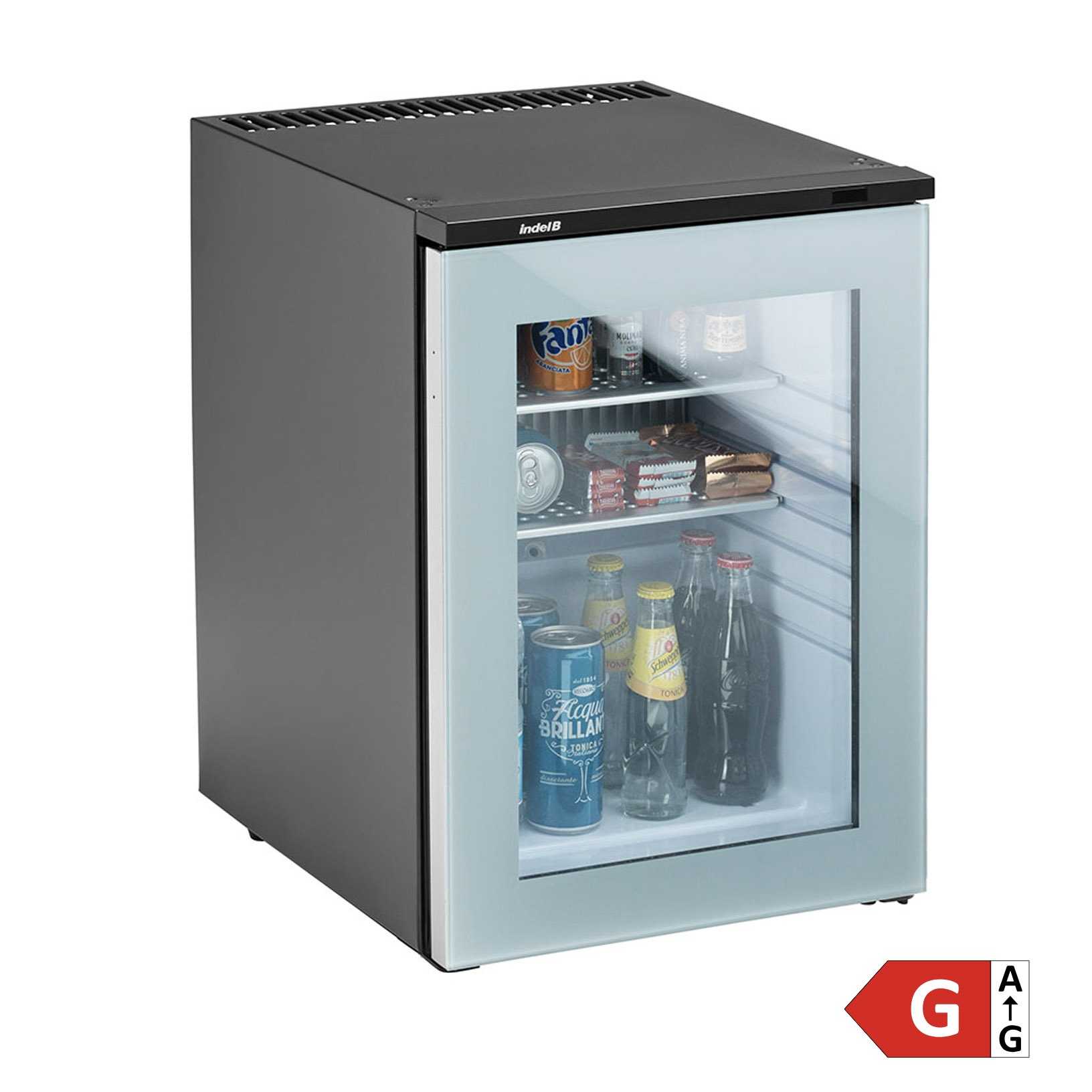 Indel B Drink T40 Plus PV is a glass door version minibar, featuring a transparent front door that allows the products inside to be visible. The clear glass door offers an aesthetic and functional solution for hotels, bars and offices. Designed for users who prioritize comfort and silence, this energy-efficient and compact minibar is ideal for various environments.
