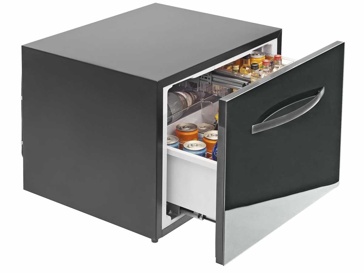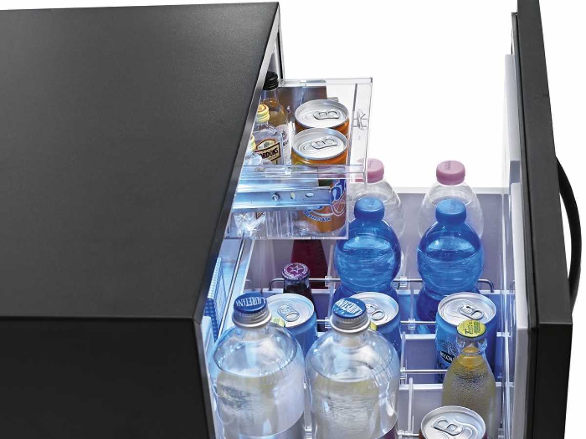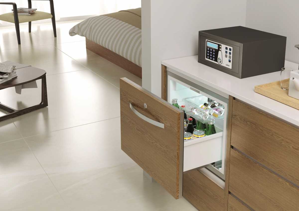 The new concept of minibar is silent and smart, it provides a drawer system for being easily accessible from above. Products are well visible thanks to the two refrigerated compartments which easily become a single one.