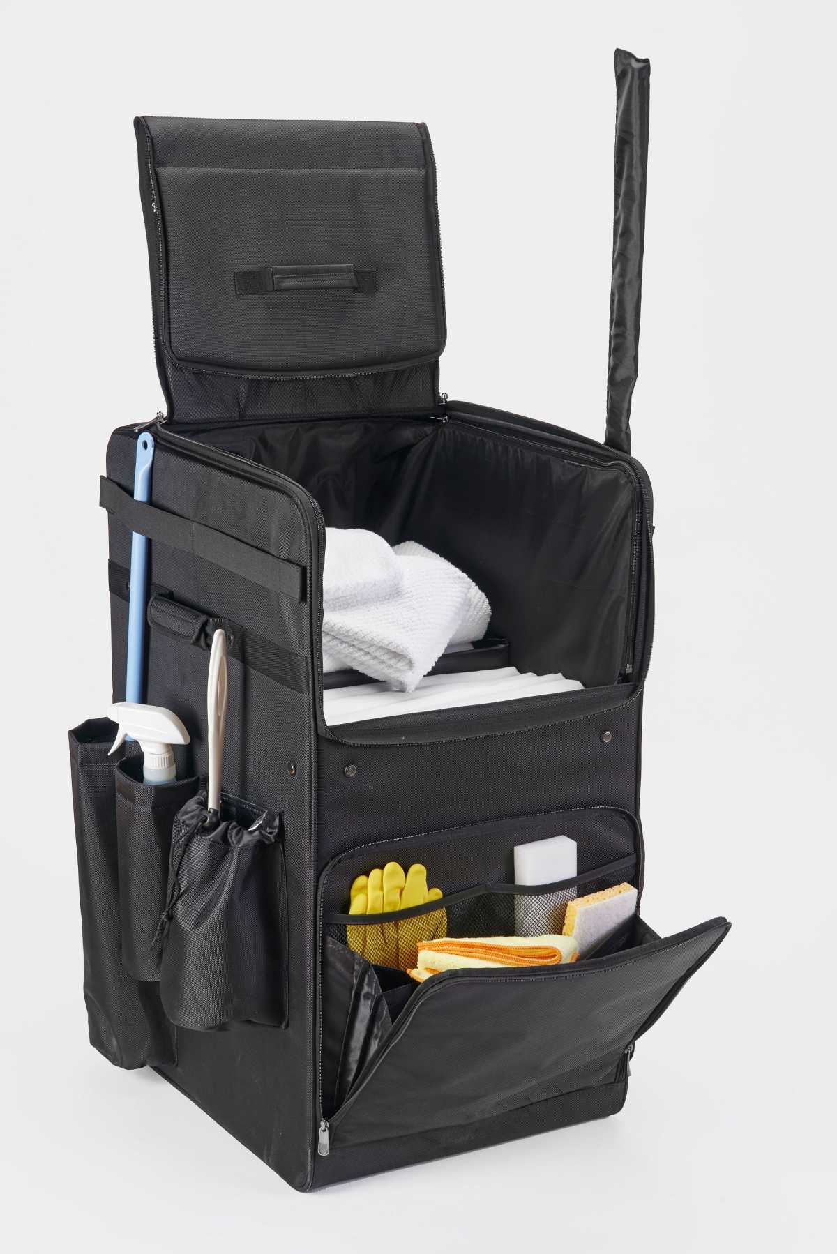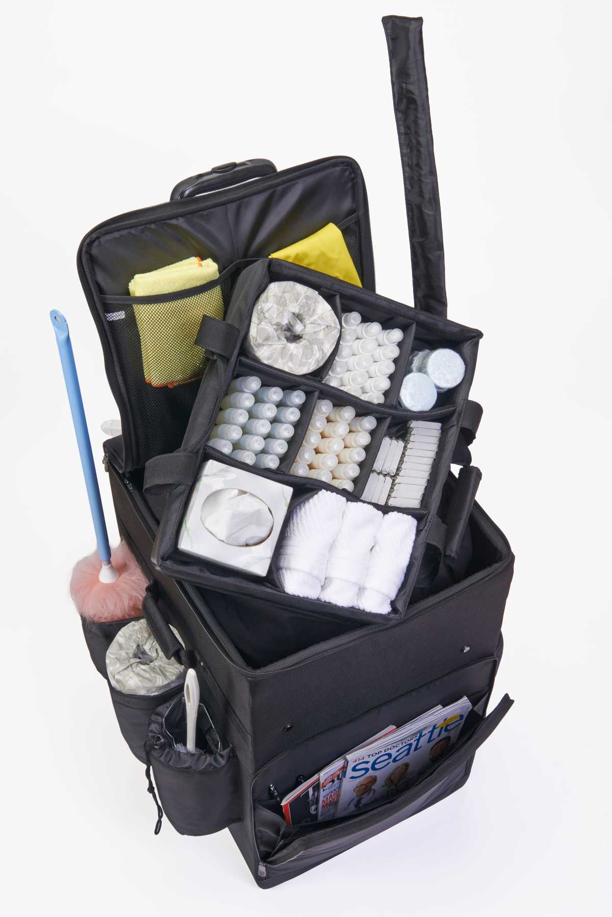 Viable alternative to carts for those properties ready to go cartless or who have already made the jump to a cartless housekeeping environment. Mobile-Pack lets housekeepers bring everything they need to clean or turn-down rooms. The Mobile-Pack Premium offers large storage spaces and plenty of pockets for a variety of amenities and cleaning products.