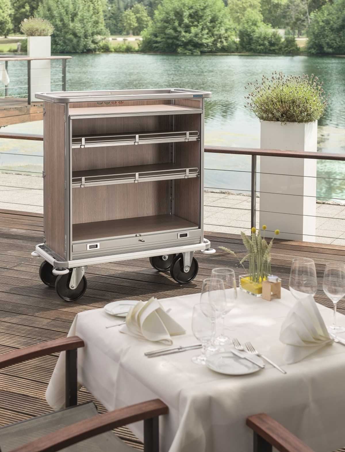 A reliable partner for minibar service with clearly structured divisions for efficient filling with bottles and small items.