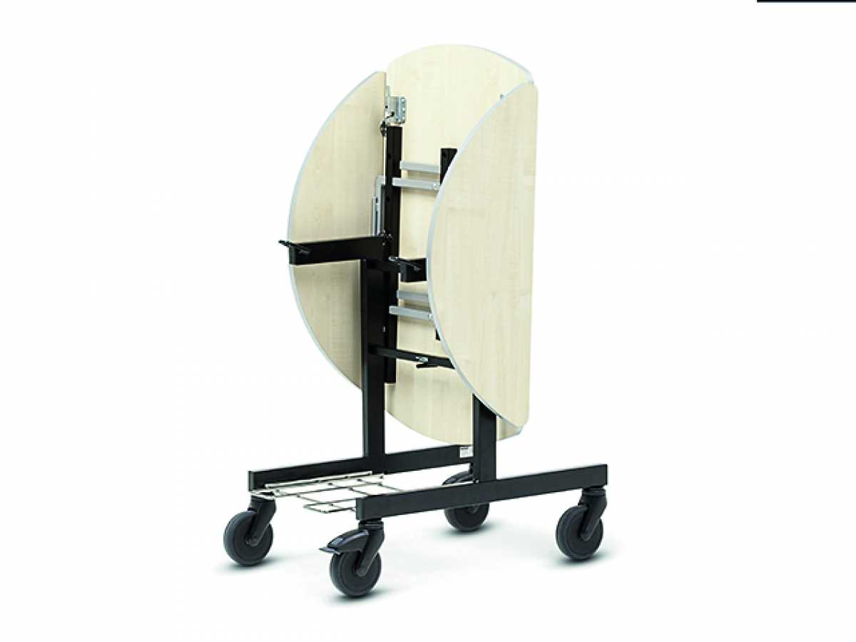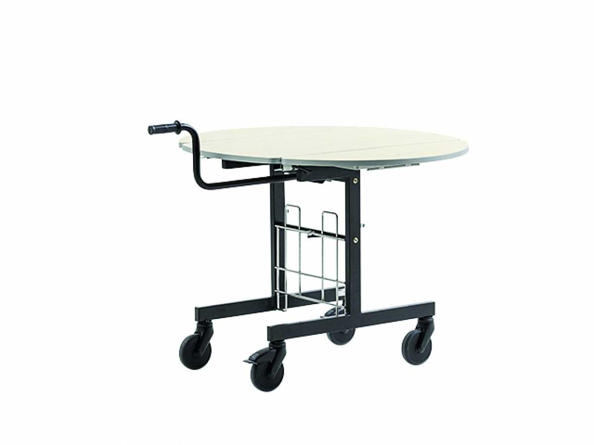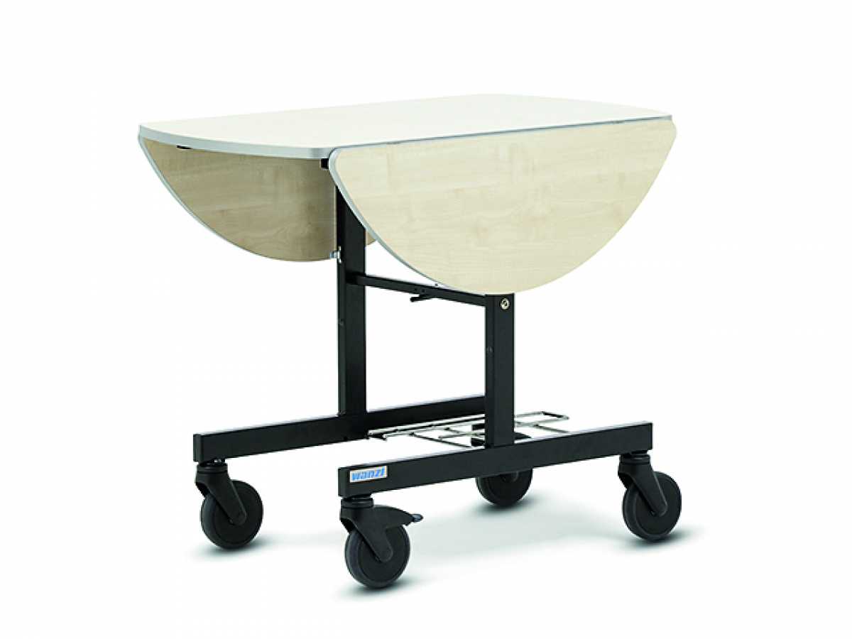Standard equipment: steel-tube design with oval tabletop in wood finish with tough, sealed edge and folddown side parts. Fold-out chrome-plated rack for the hot box. The tabletops can be locked in a vertical position for storage and transport and the RSVC-Comfort can be nested to save space.