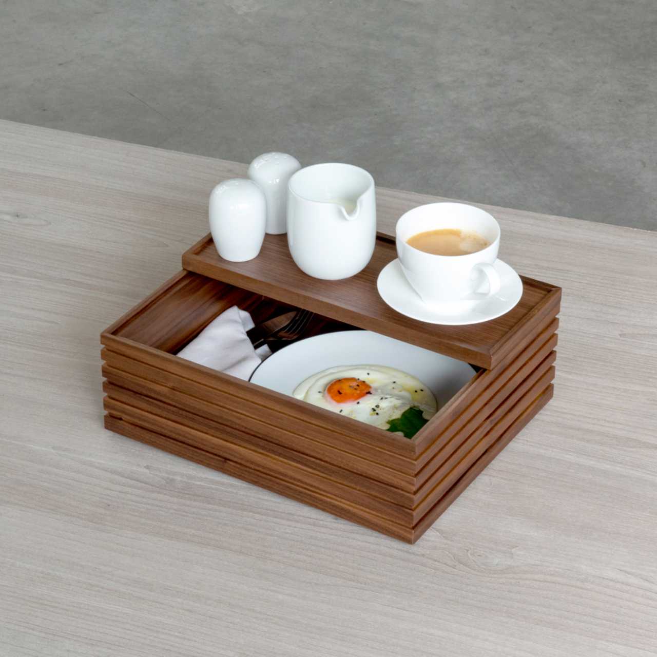 Daha küçük atıştırmalıkların veya sandviçlerin sunumu için ideal olan bu düzende, 29 cm çapında bir tabak ve çatal-bıçak kapasiteli 1.2 tepsi, kahve ve çay fincanlarının, çaydanlıkların sunumu için 1.8 kapak bulunur. Meşe olarak da mevcuttur.