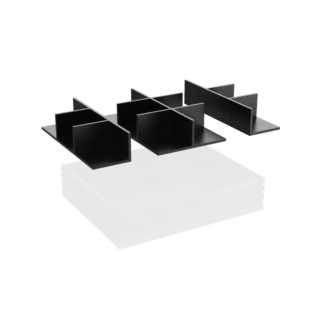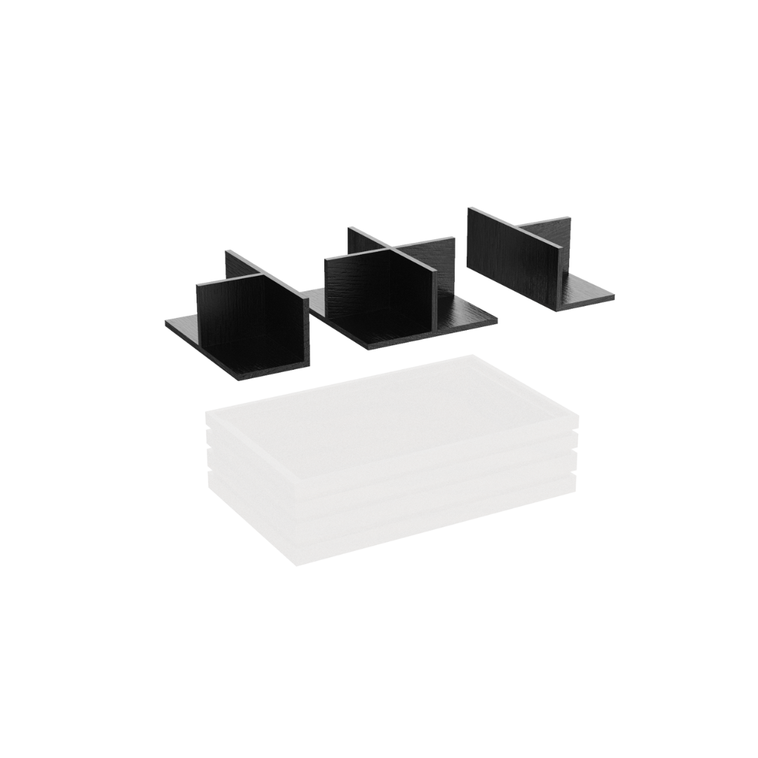 Poşetlerin, karıştırıcıların ve mutfak gereçlerinin zahmetsizce düzenlenmesi için tepsileri ve kutuları bölümlere ayıran modüler bölücüler, içecek istasyonlarını özenle tasarlanmış, tasarım odaklı alanlara dönüştürür. Siyah renkte Flow 1.2 ve 1.4 Bölücü Setleri de dahil olmak üzere, birden fazla konfigürasyon ve boyutta mevcuttur; özel yerleşim kontrolü için T ve X Bölücü seçenekleri de sunulmaktadır.