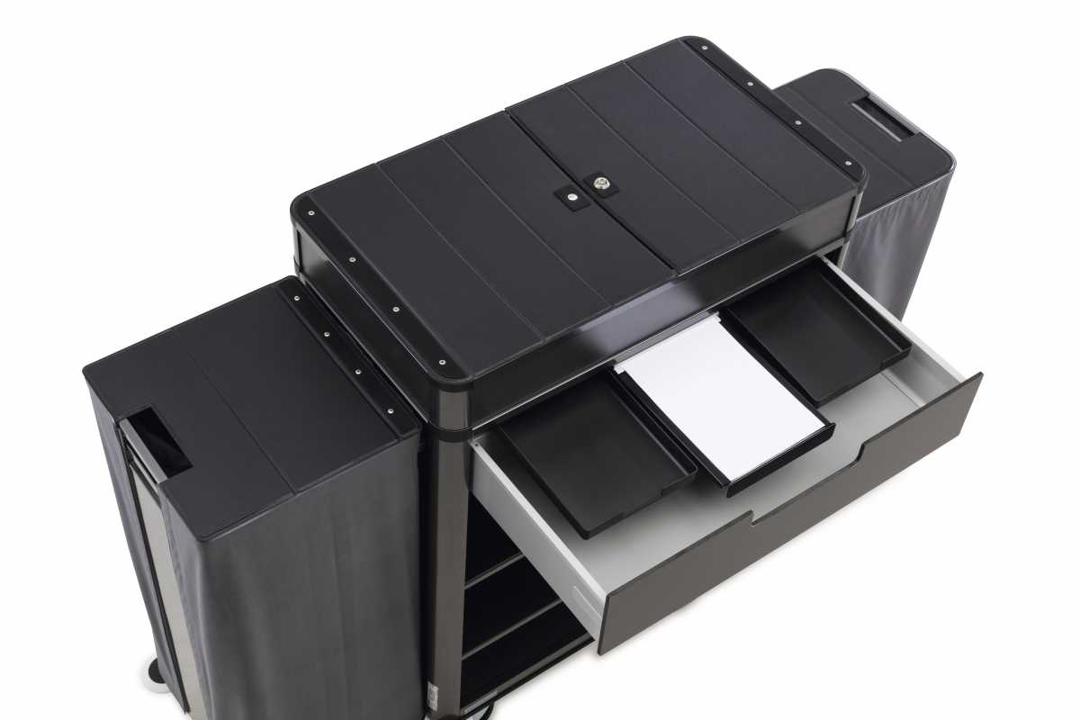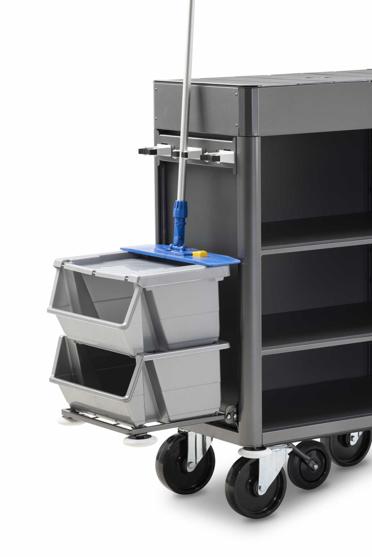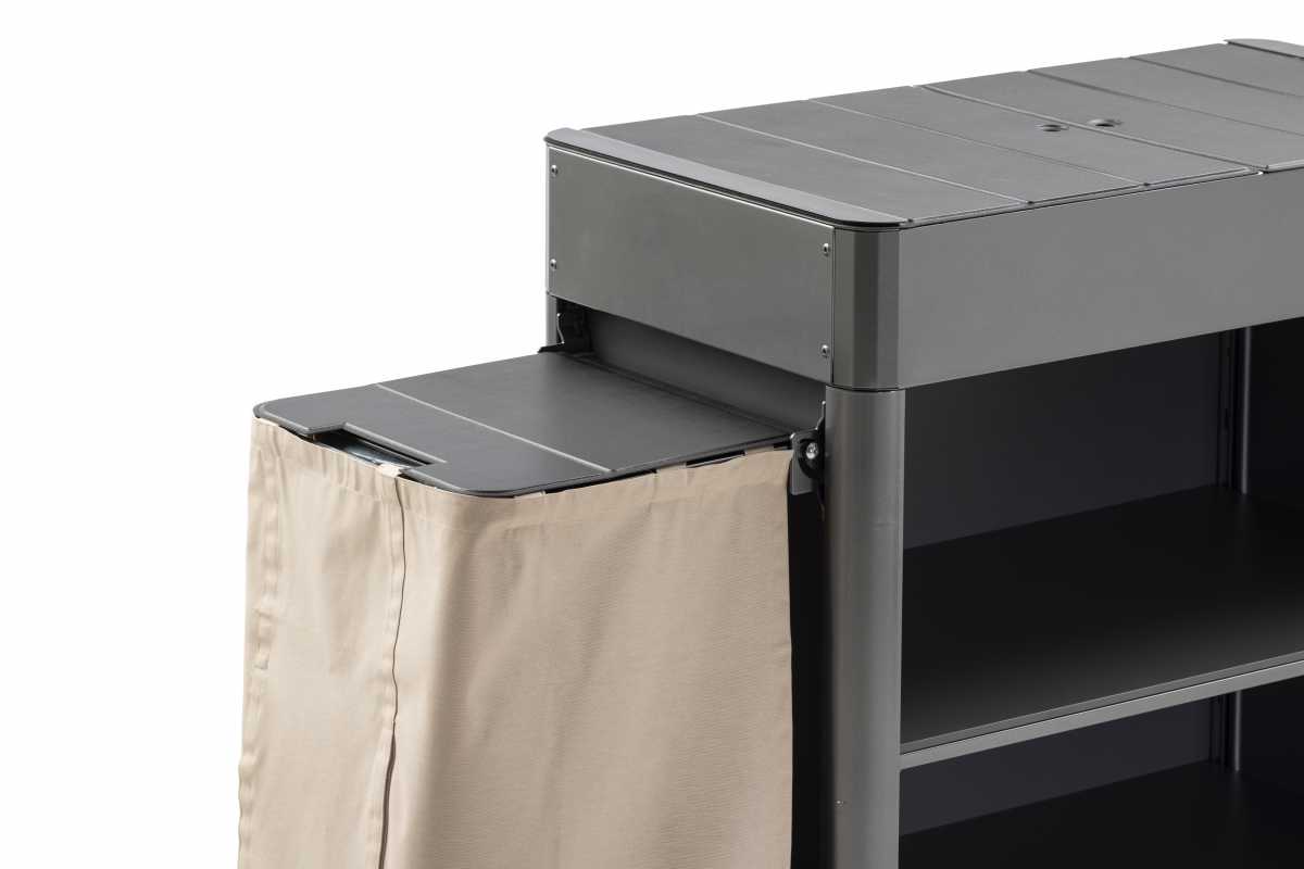 • Temizlik ve çöp torbalarının asılması için katlanır yan profiller